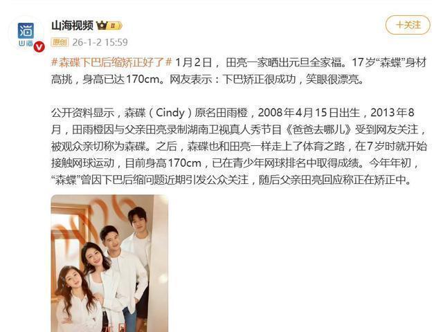 2026年元旦,田亮一家晒出的温馨全家福,瞬间让网友的目光聚焦在了女儿森碟(田雨橙)身上。照片里,17岁的她身高已达170公分,身材高挑,眉眼间继承了妈妈叶一茜的精致,而最引人注目的,莫过于她那变得清晰流畅的下颌线条——曾经引发全网讨论的“下巴后缩”问题,经过约一年的科学矫正后,效果堪称惊艳,被网友赞为“美出了新高度”。